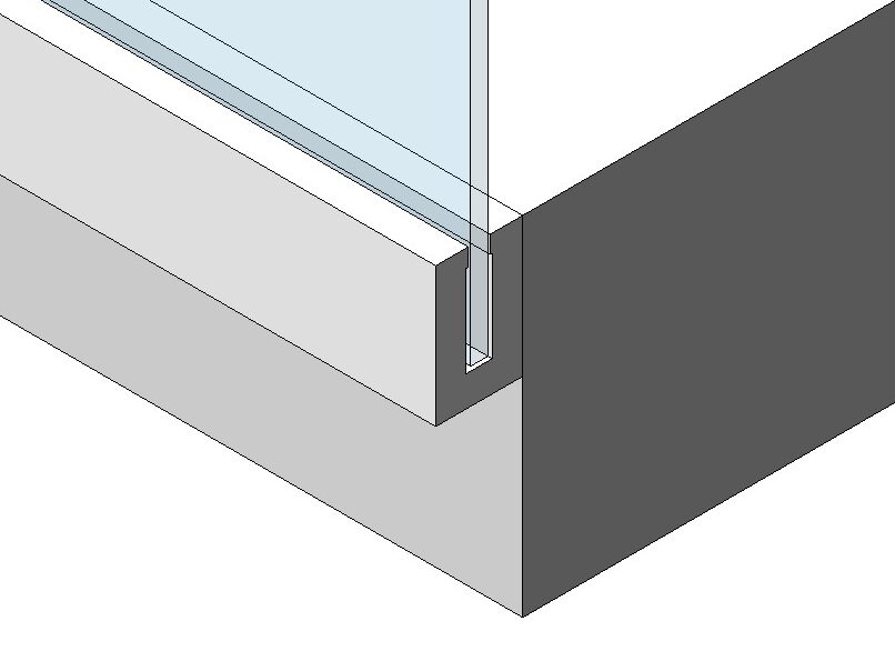 The railing height is adjustable by modifying the parametric profile of the glass panel, allowing flexible design control. The round top cap rail and shoe base are modeled as separate profiles that can also be adjusted to accommodate different glass thickness. The shoe base is attached to the edge of the floor or slab, or can be recessed in the floor.