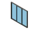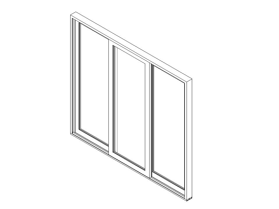 Revit family of three-panel sliding door with two fixed panels and one operable slider, featuring slim aluminum or wood framing, clear glazing, and Coarse detail level support.