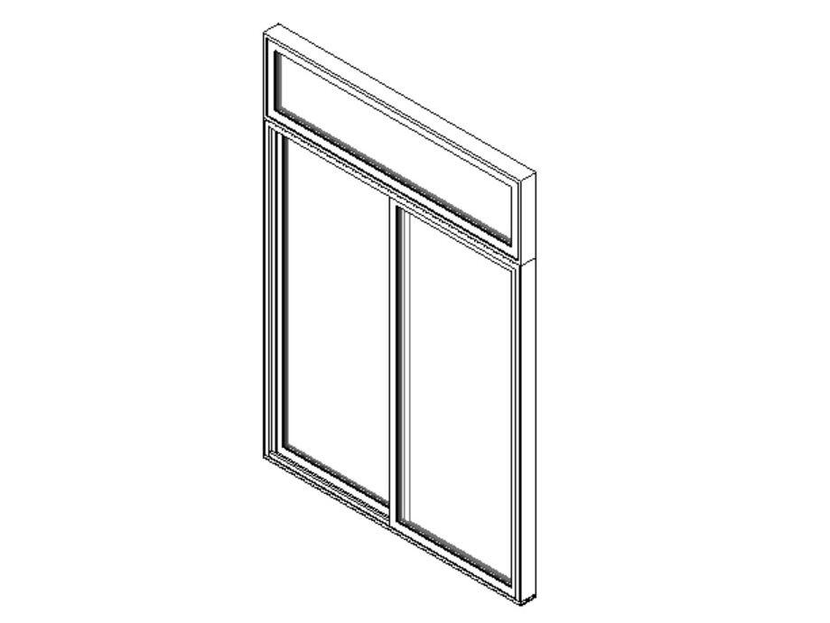 Two-panel sliding glass door Revit generic family featuring a transom designed for residential or commercial applications. The model features an aluminum or wood frame with one fixed and one sliding panel.